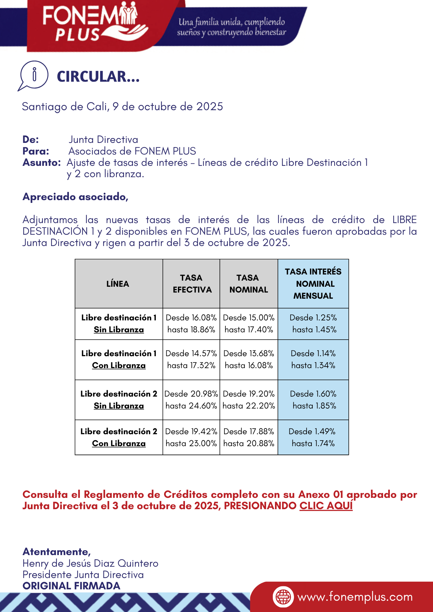 AJUSTE DE TASAS DE INTERÉS – LÍNEAS DE CRÉDITO DE LIBRE DESTINACIÓN 1 Y 2 CON LIBRANZA Octubre 9, 2025 9Oct CLICK AQUÍ para ver REGLAMENTO DE OTORGAMIENTO DE CREDITO CLICK AQUÍ para ver ANEXO 01 AL REGLAMENTO DE OTORGAMIENTO DE CREDITO