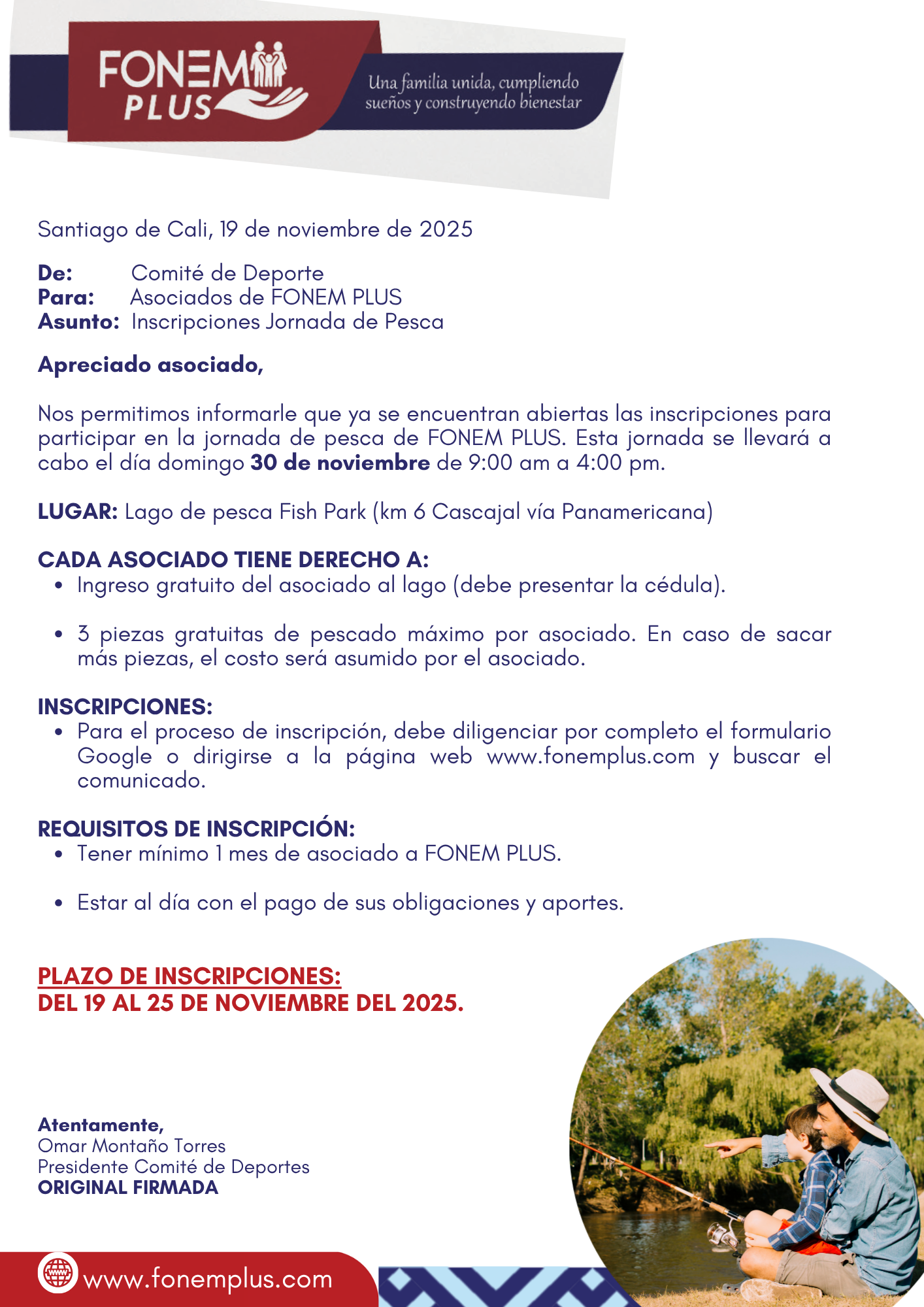 UN GRAN DÍA DE PESCA DEPORTIVA TRAE PARA TI ASOCIADO FONEM PLUS.🐟 Noviembre 19, 2025 19Nov Inscripciones abiertas hasta el 25 de noviembre de 2025. 📝Formulario de Inscripción.