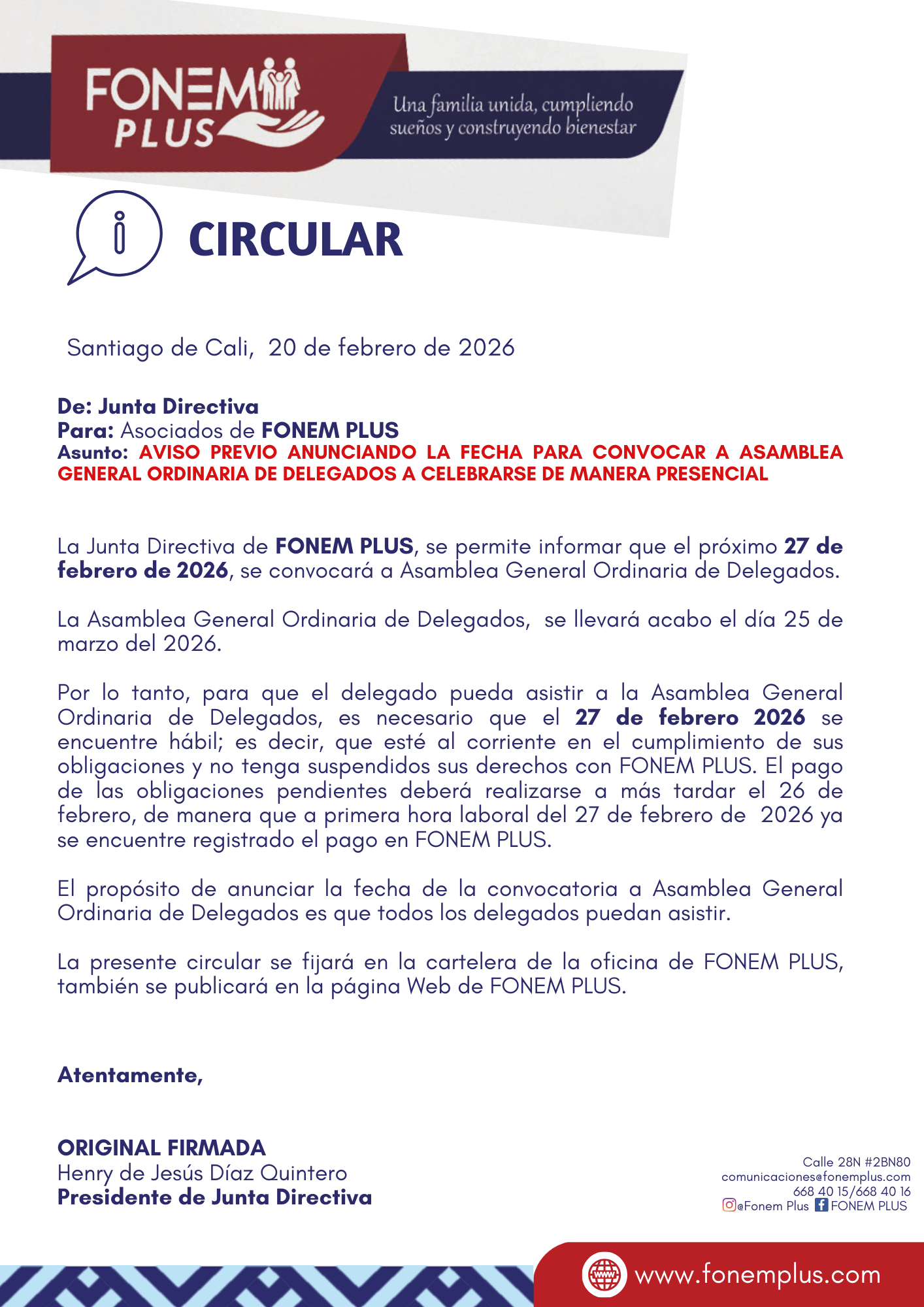 AVISO PREVIO ANUNCIANDO LA FECHA PARA CONVOCAR A LA ASAMBLEA GENERAL ORDINARIA DE DELEGADOS