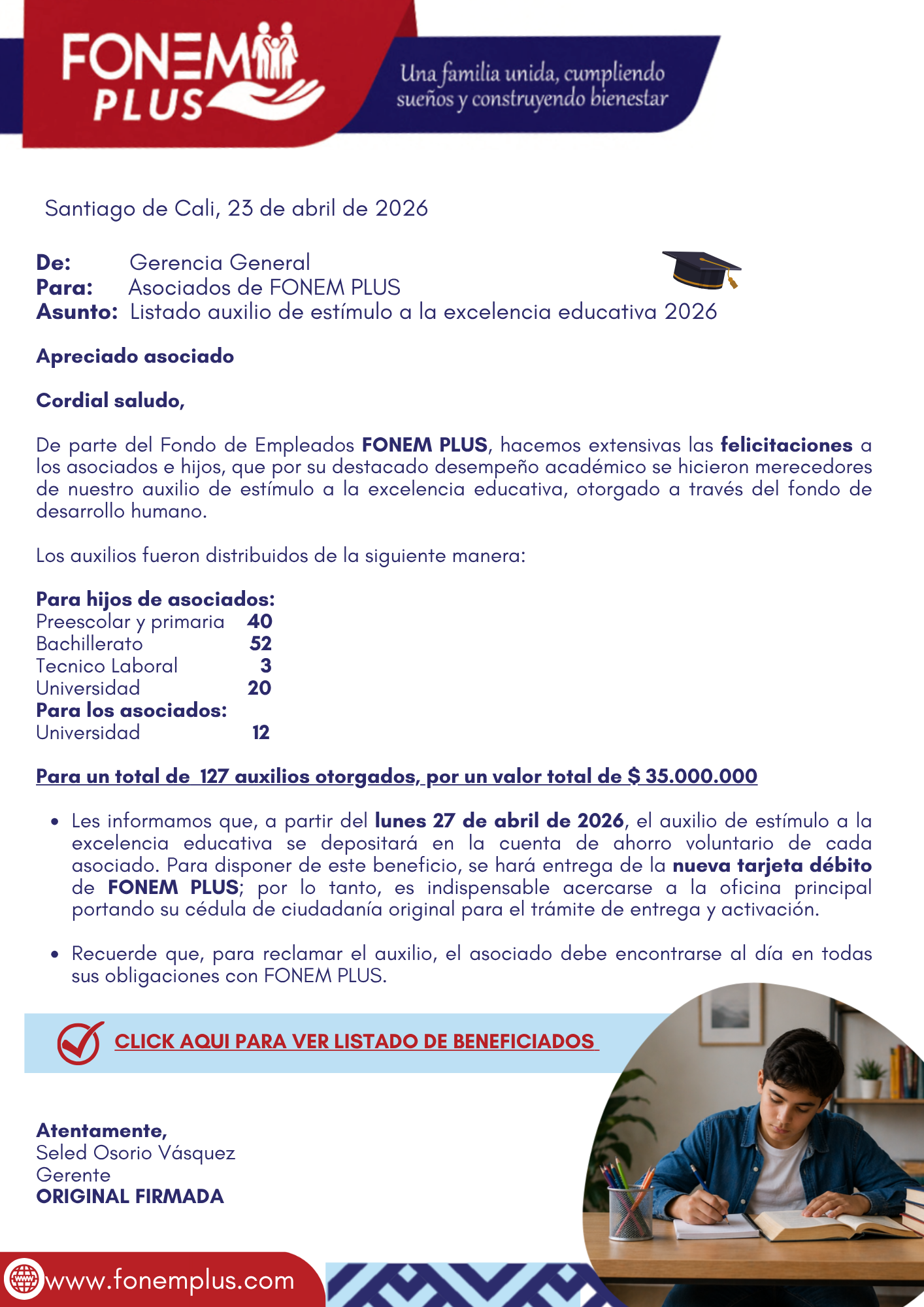 Apreciado asociado, le compartimos la circular donde informamos la fecha de la Asamblea General Ordinaria de Delegados de FONEM PLUS 2026
