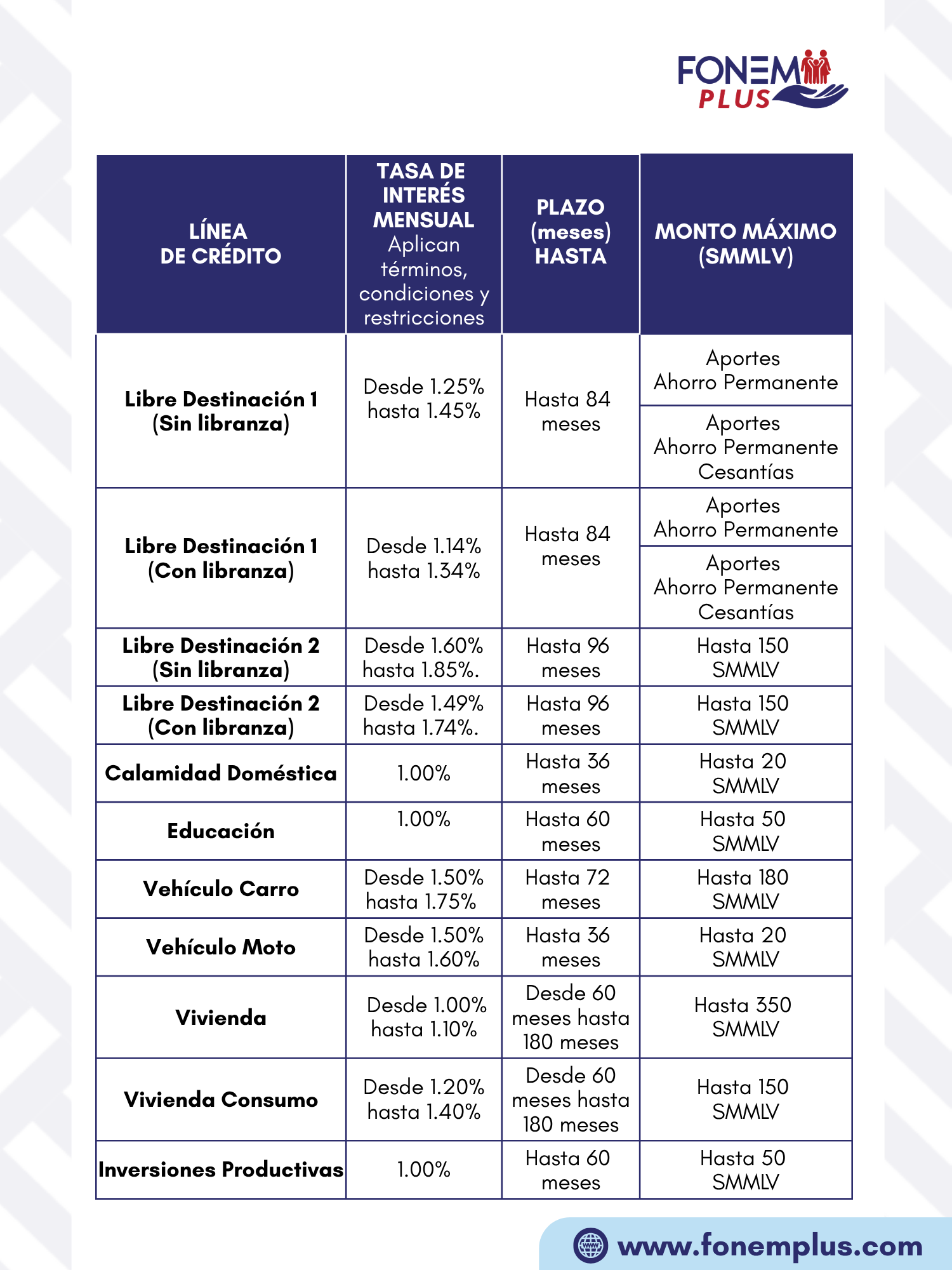 A continuación se relacionan los montos, plazos y tasas de interés por cada una de los tipos de crédito que se manejan actualmente: