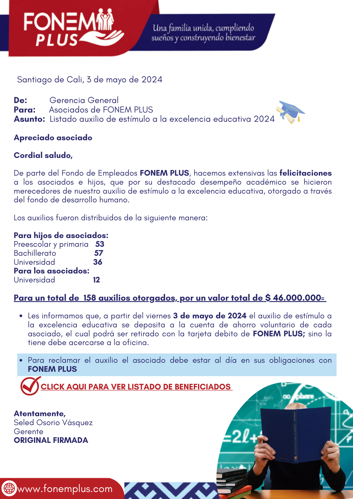 AUXILIO ESTÍMULO A LA EXCELENCIA EDUCATIVA 📚 May 3, 2024 3May ESTÍMULO A LA EXCELENCIA EDUCATIVA Apreciado Asociado le compartimos el listado de los auxilios aprobados para el año 2024. CLICK AQUÍ para conocer el listado completo