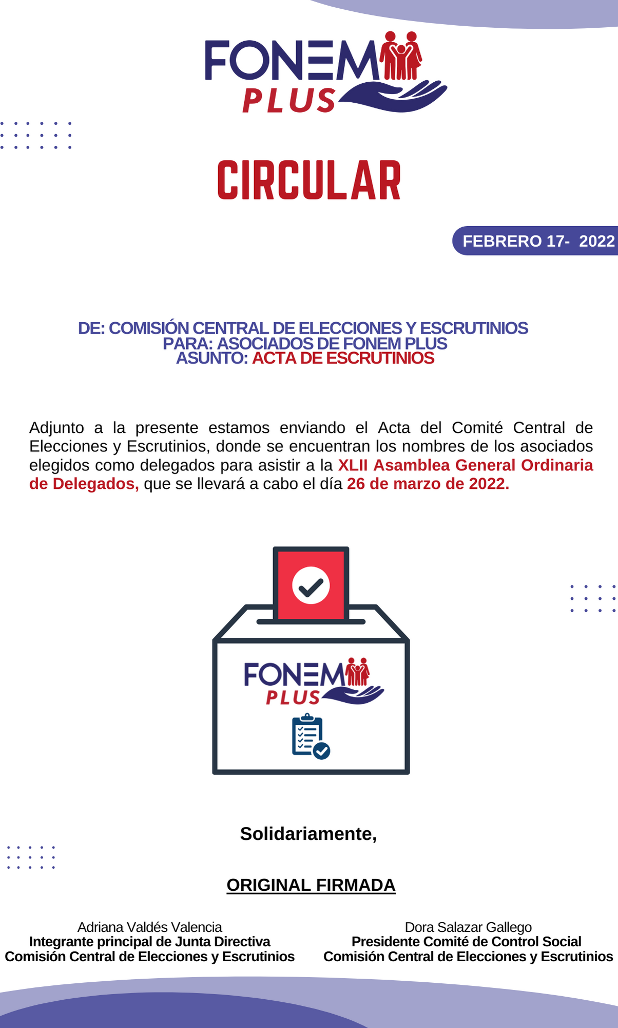 Apreciado asociado, le compartimos la circular donde informamos los asociados elegidos como Delegados de FONEM PLUS 2022