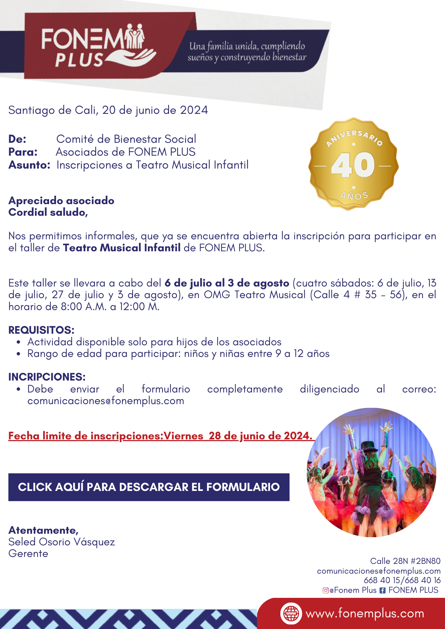 Teatro Musical Infantil Junio 19, 2024 19Jun ¡YA LLEGÓ! Teatro Musical Infantil 📝Formulario de Inscripción.