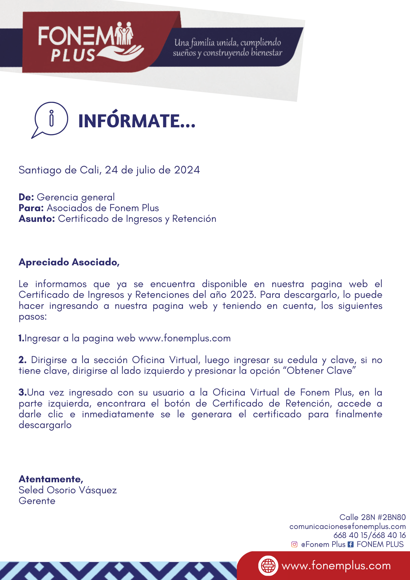 A través de la web podrá acceder a su certificado de Ingresos y Retención de FONEM PLUS.