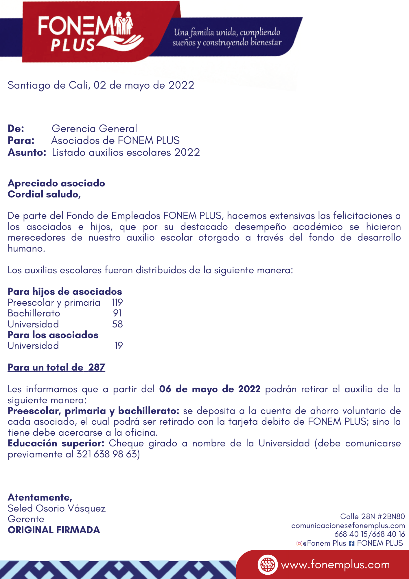 Apreciado asociado, le compartimos la circular donde informamos la fecha de la Asamblea General Extraordinaria de Delegados No Presencial de FONEM PLUS