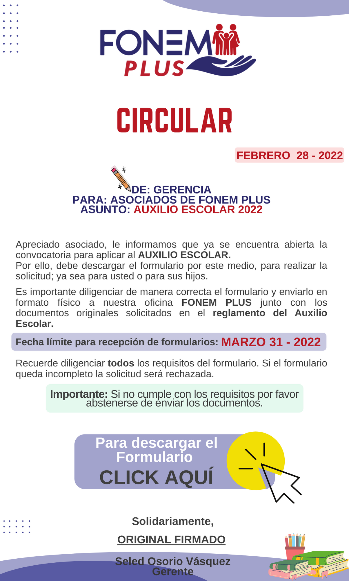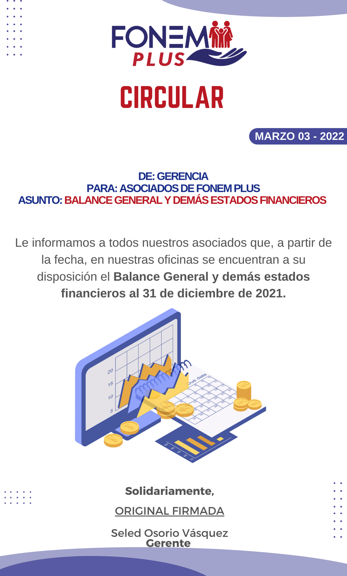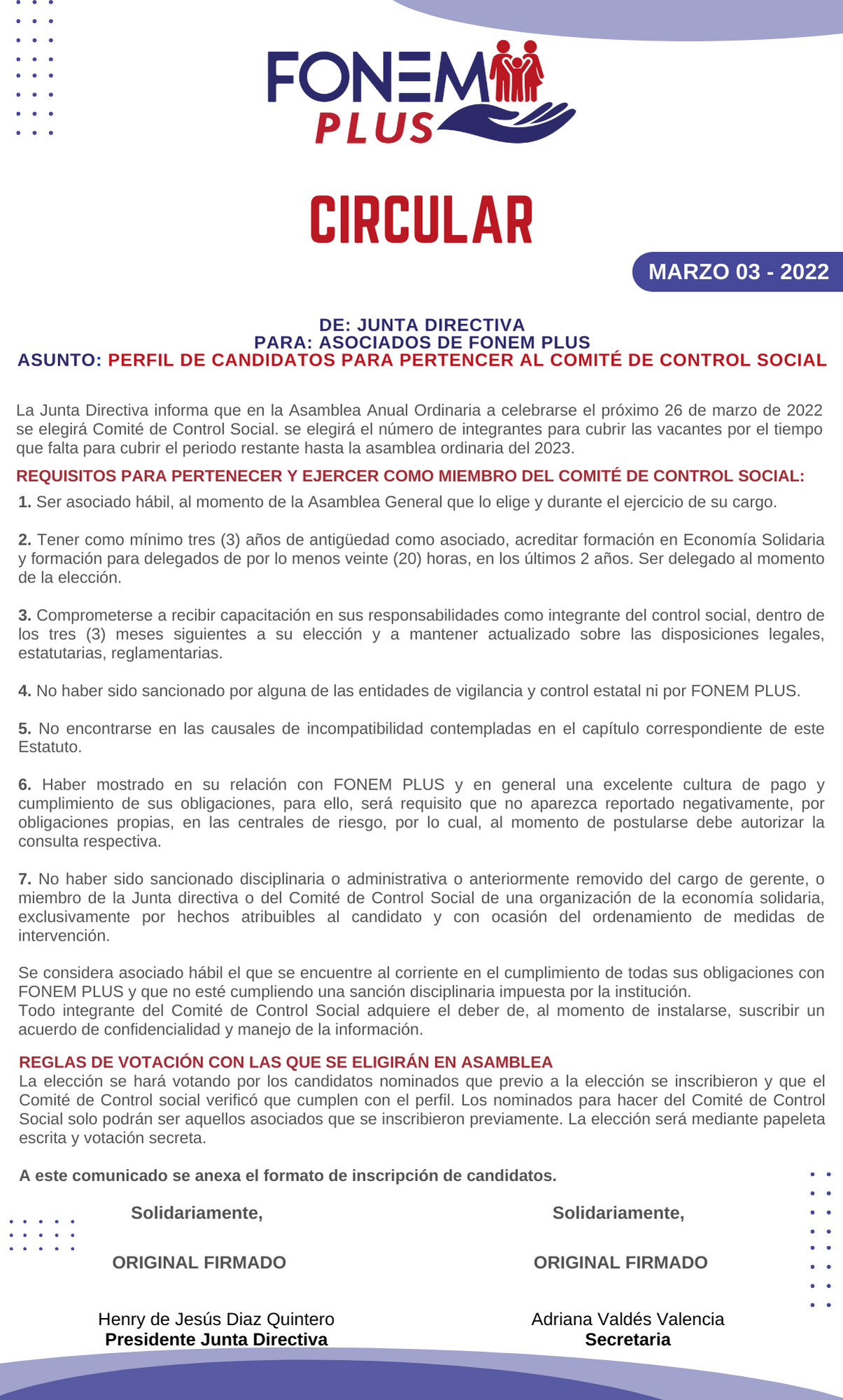 Apreciado asociado, le compartimos la circular donde informamos la fecha de la Asamblea General Ordinaria de Delegados de FONEM PLUS 2022