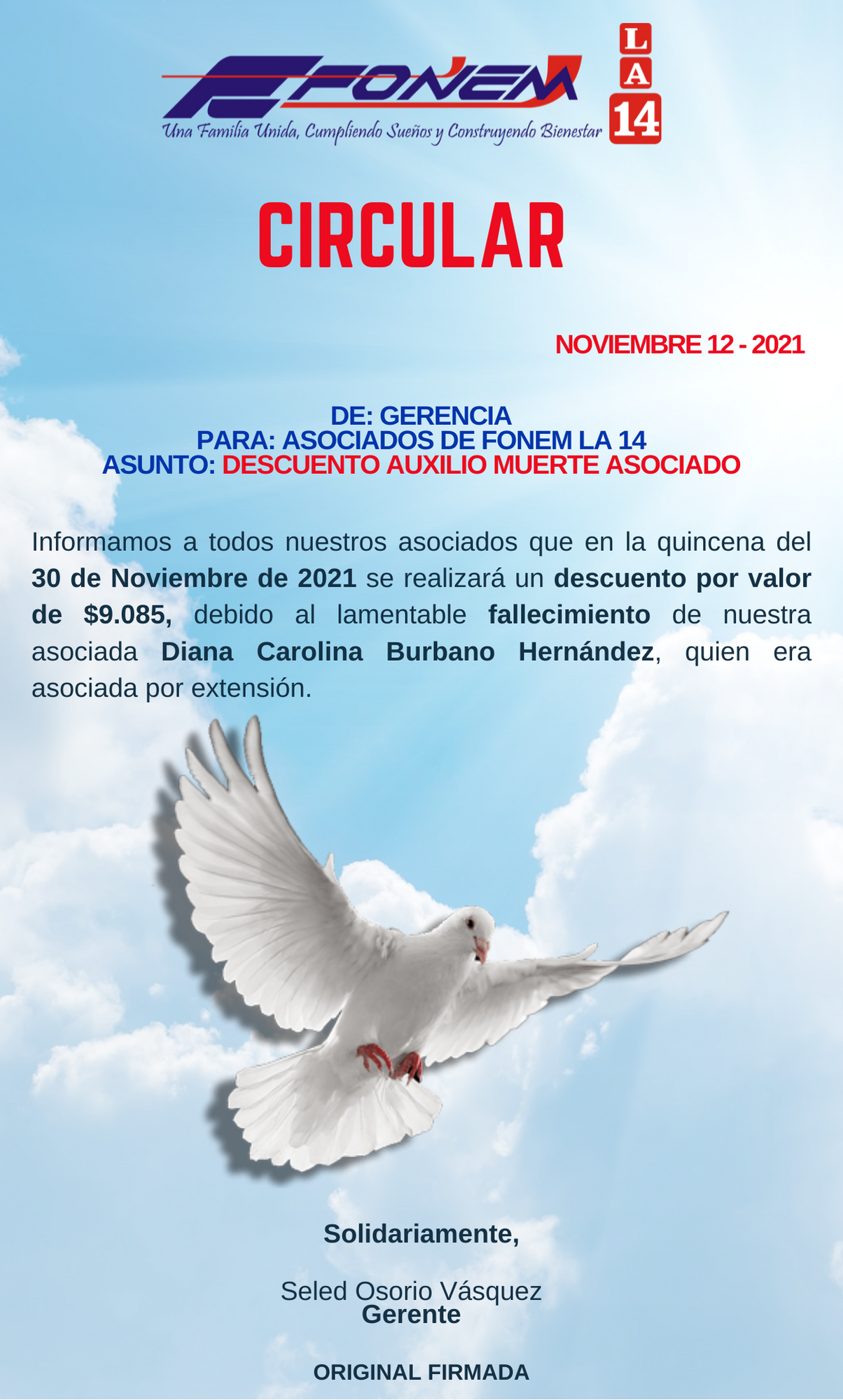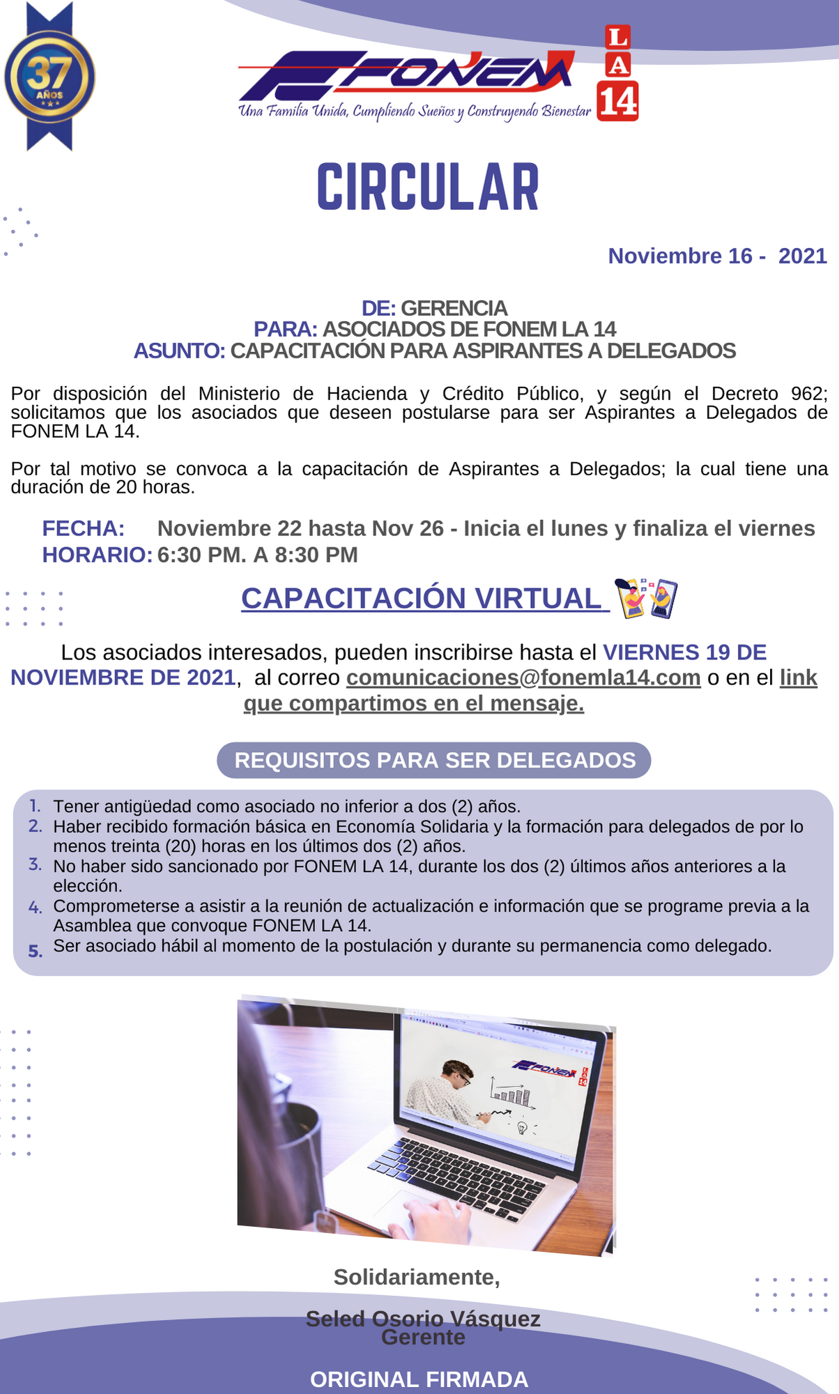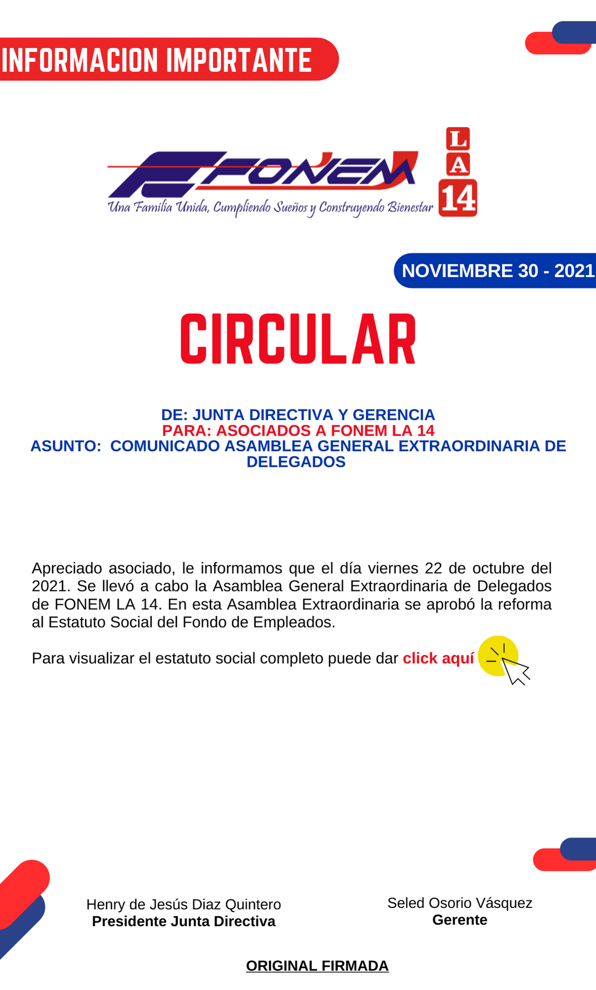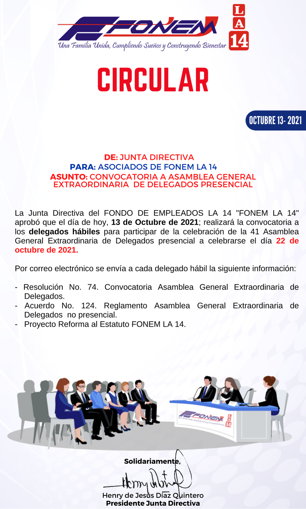 Apreciado asociado, le compartimos la circular donde informamos la fecha de la Asamblea General Extraordinaria de Delegados Presencial de FONEM LA 14