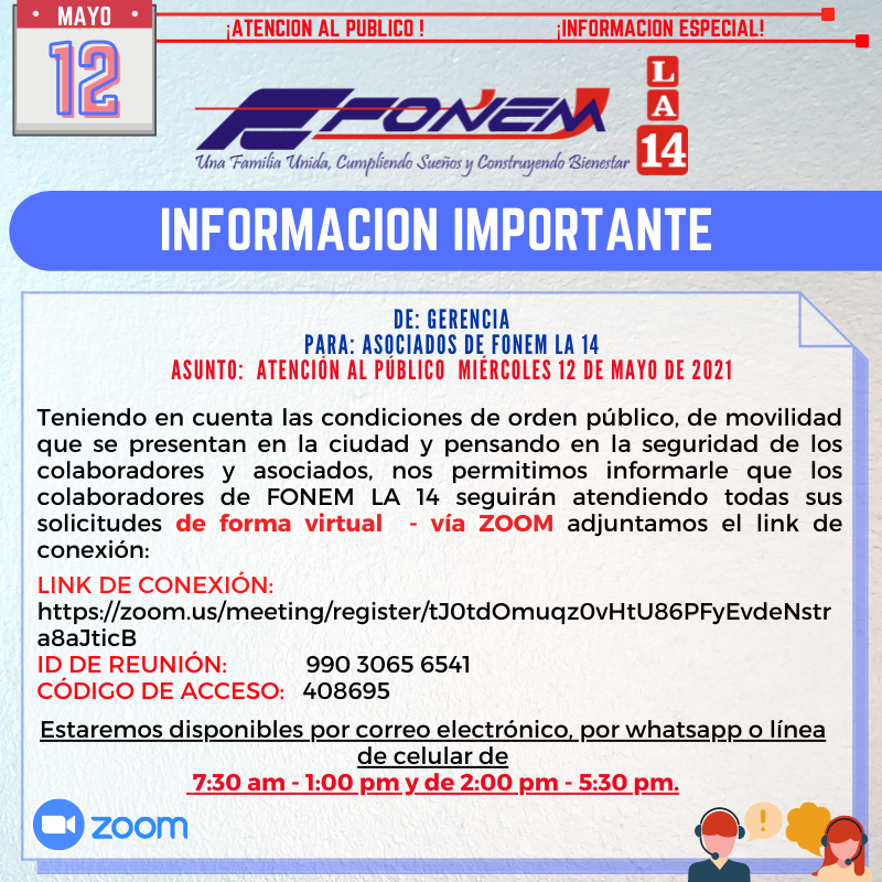 ATENCIÓN AL PÚBLICO MAYO 12 - 2021 May 11, 2021 11May LINK DE CONEXIÓN: https://zoom.us/.../tJ0tdOmuqz0vHtU86PFyEvdeNstra8aJticB
