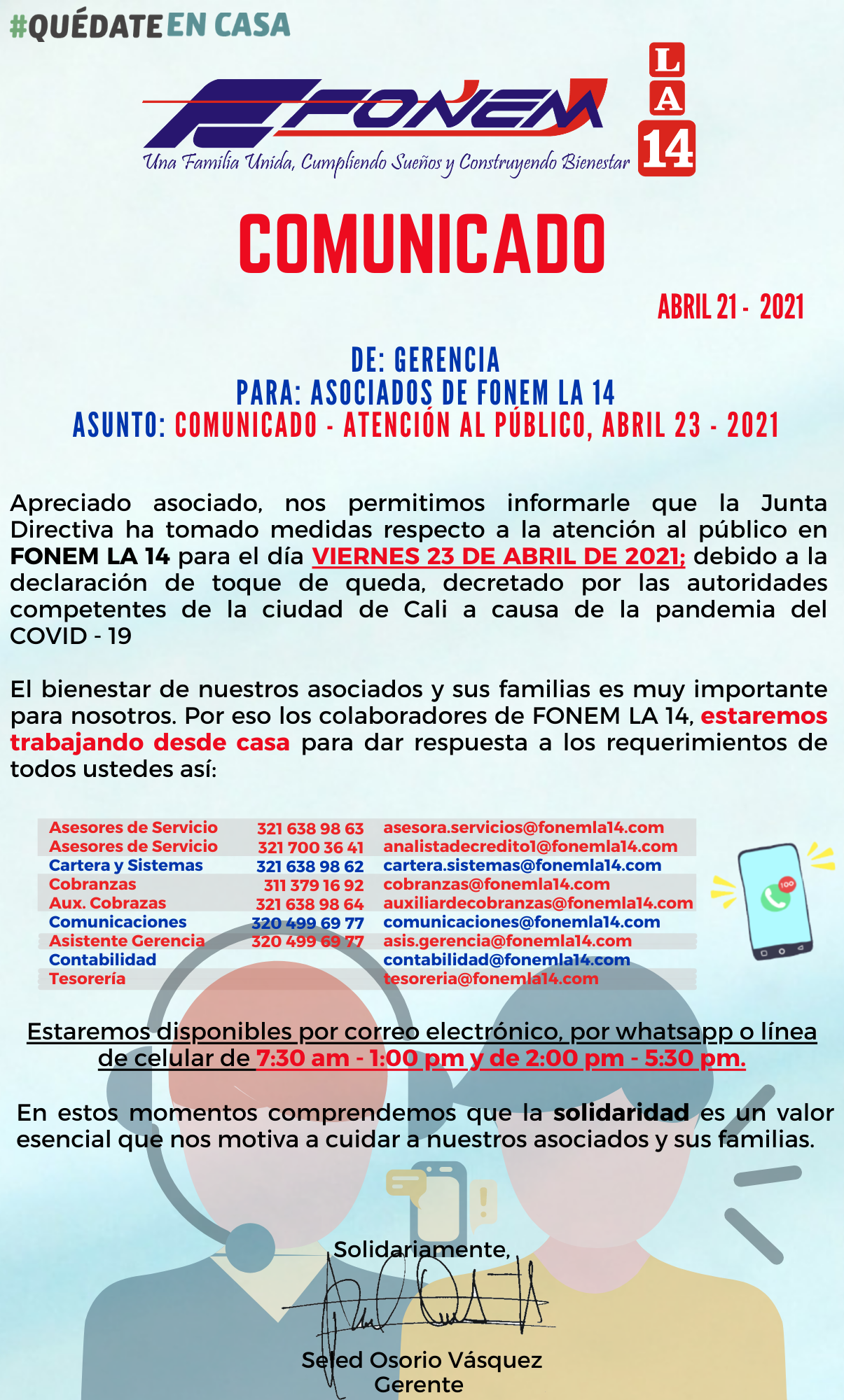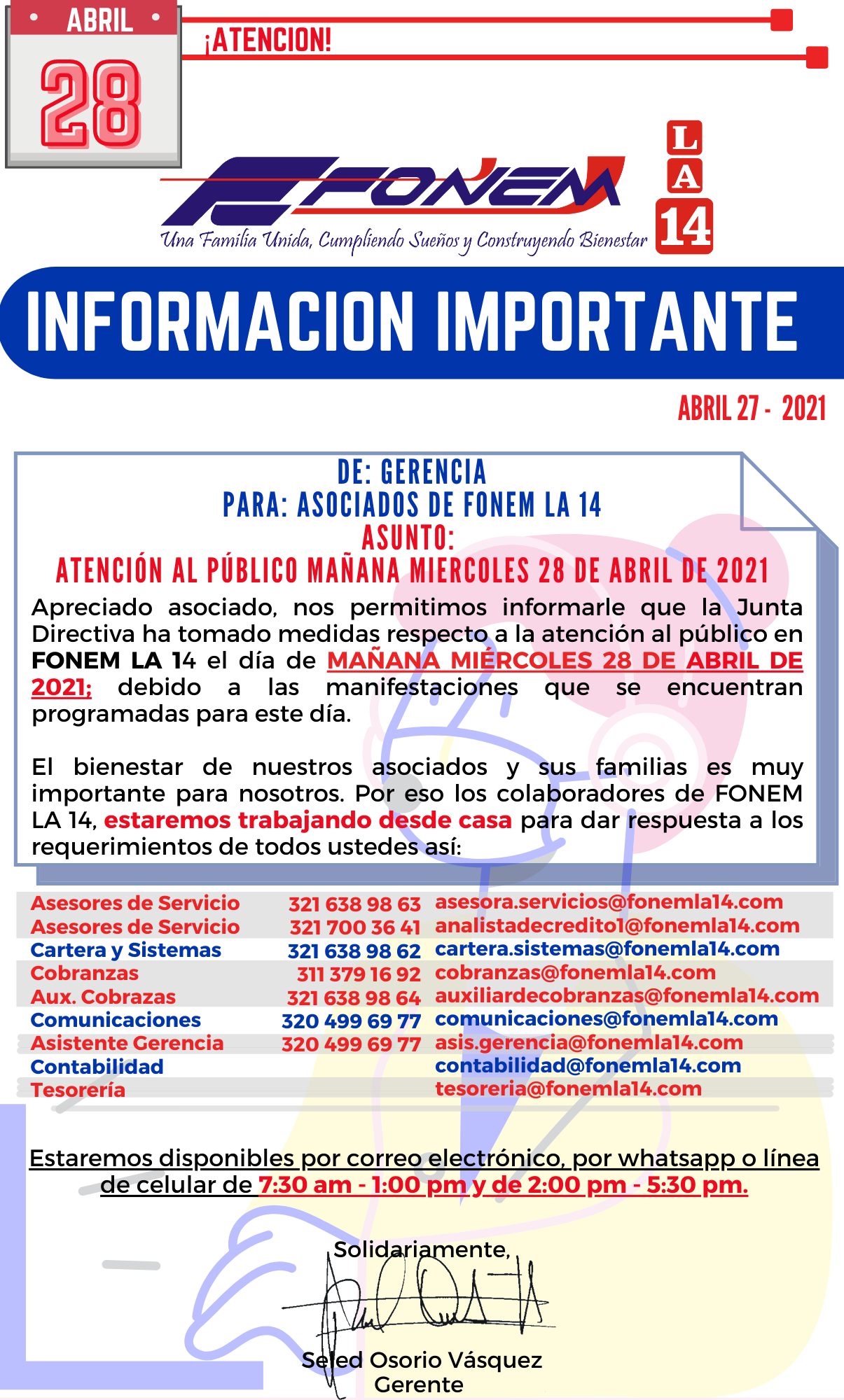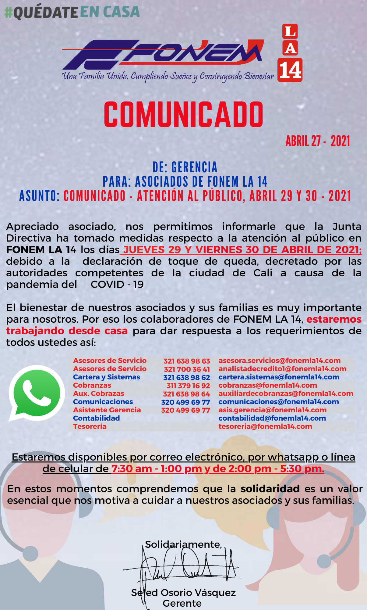 Apreciado asociado le informamos cómo será la atención al público los días Jueves 29 y Viernes 30 de abril del presente año.