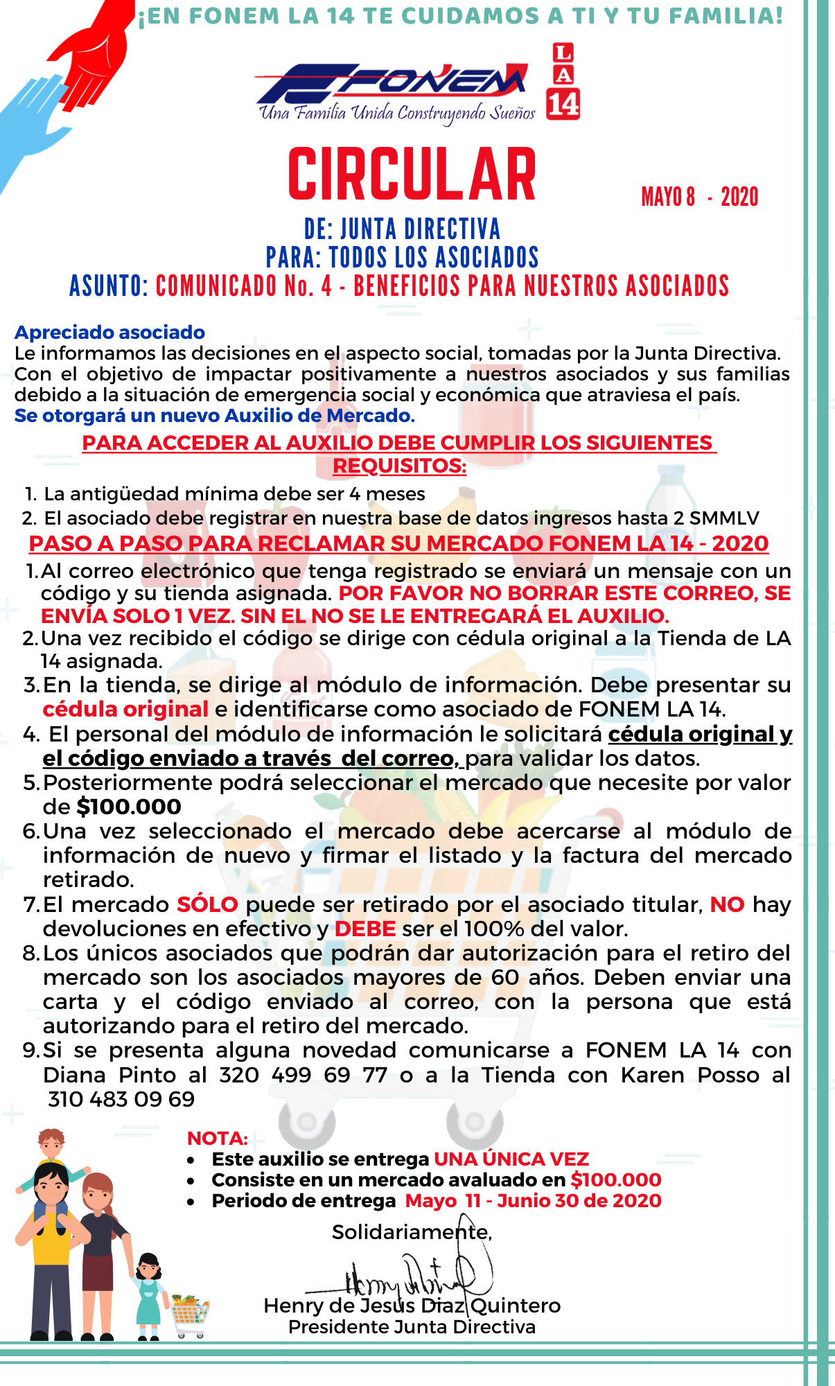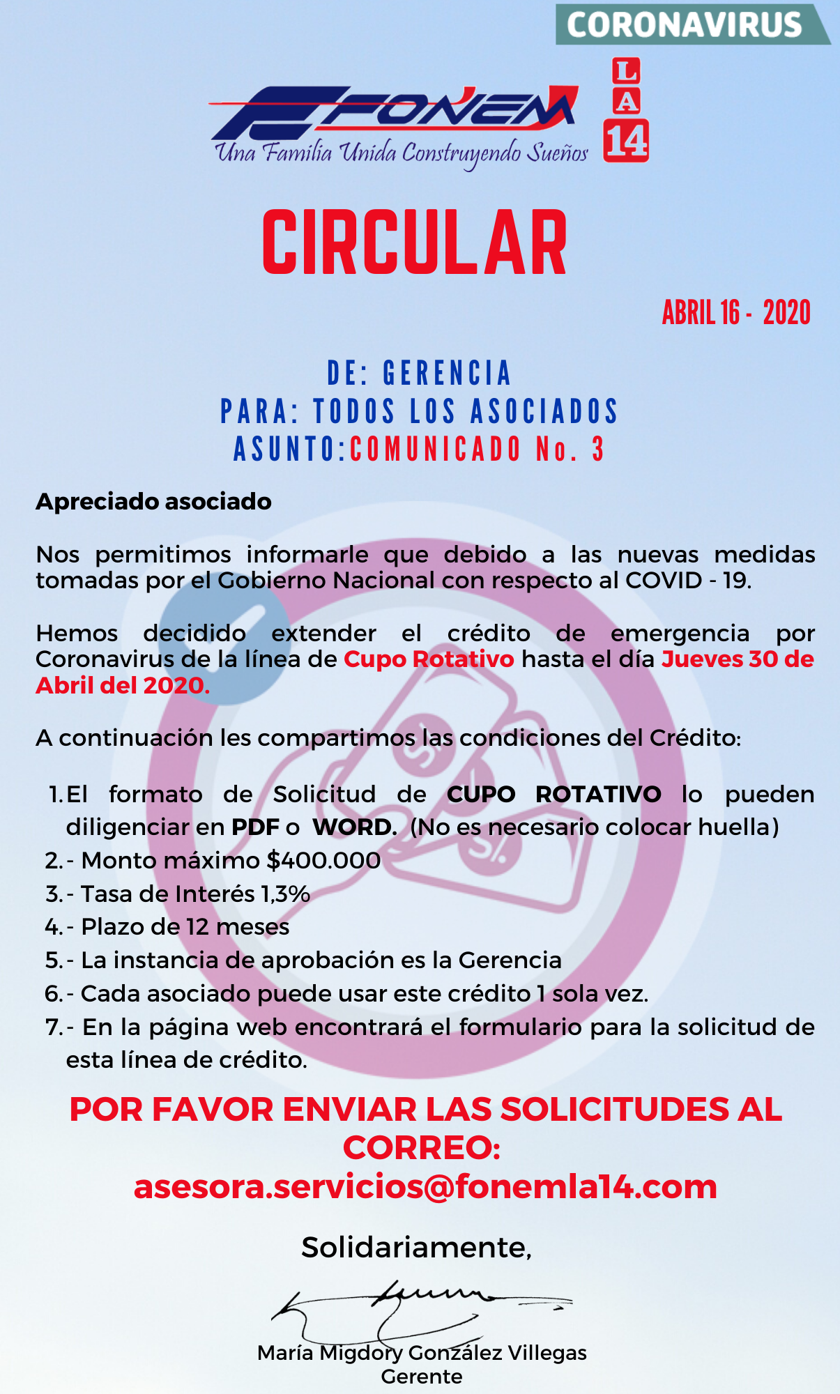 Apreciado asociado, le compartimos esta circular informativa con este gran beneficio que le será otorgado por FONEM LA 14.