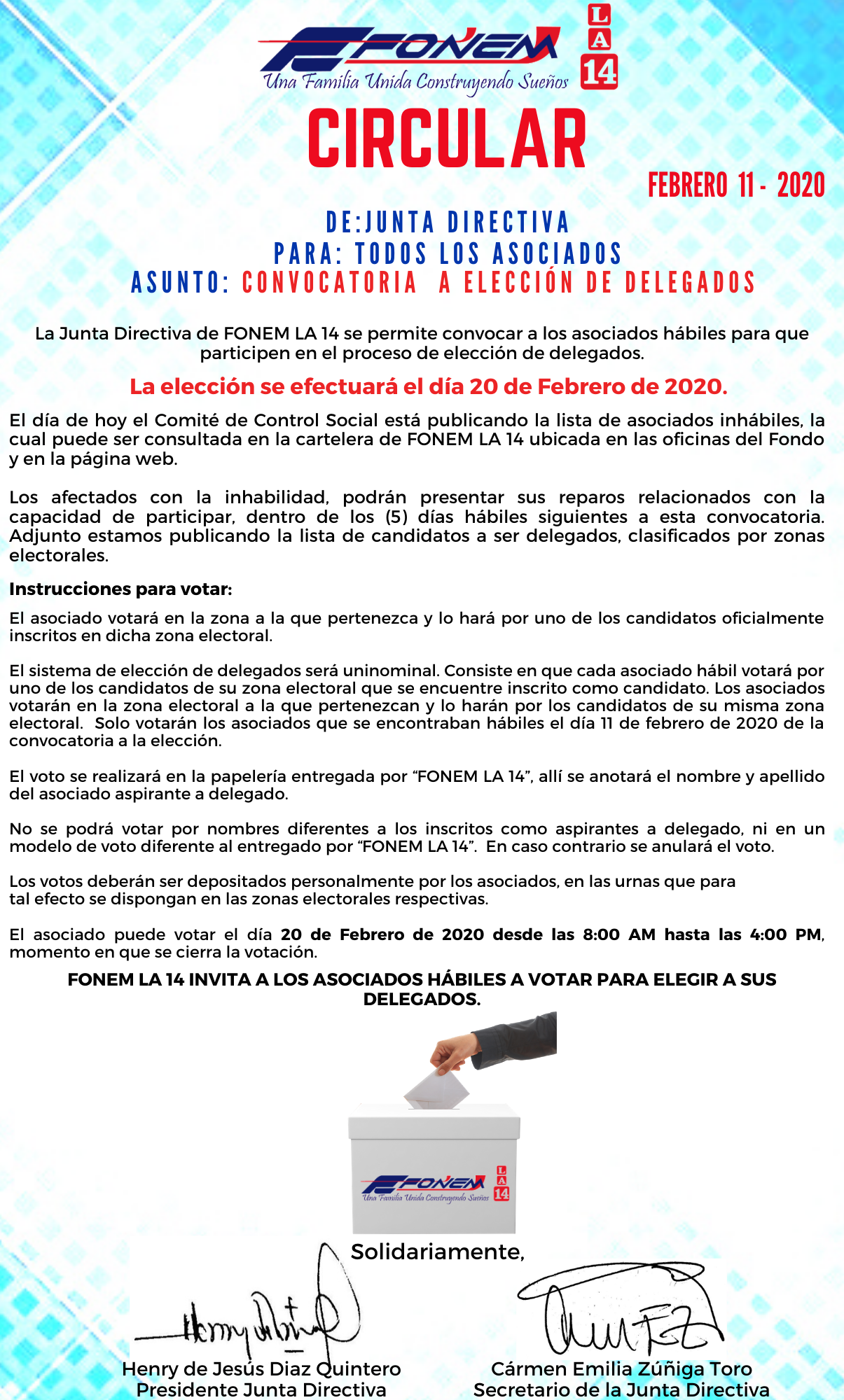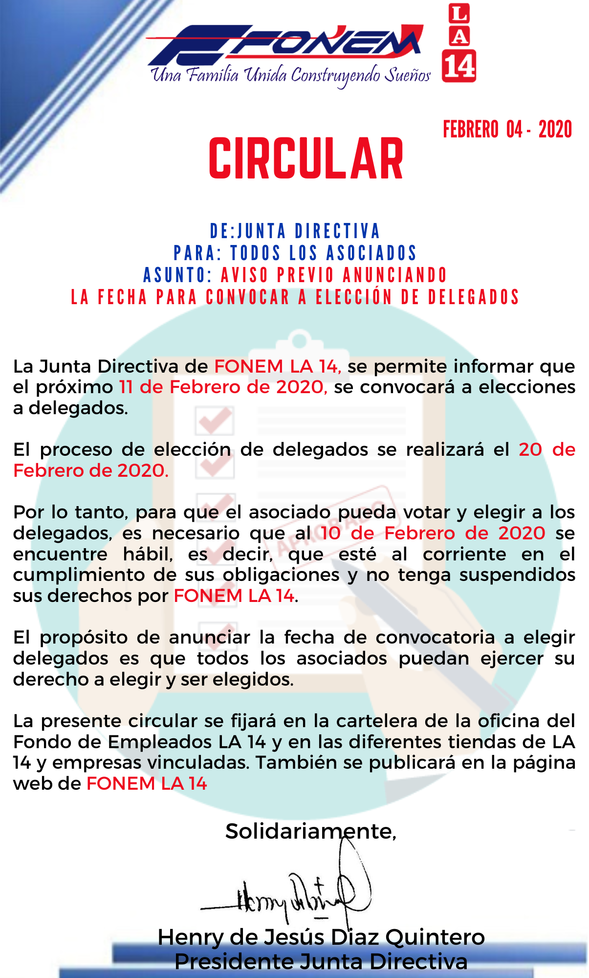 Apreciado asociado, le compartimos la circular donde informamos el proceso de elección de Delegados de FONEM LA 14.