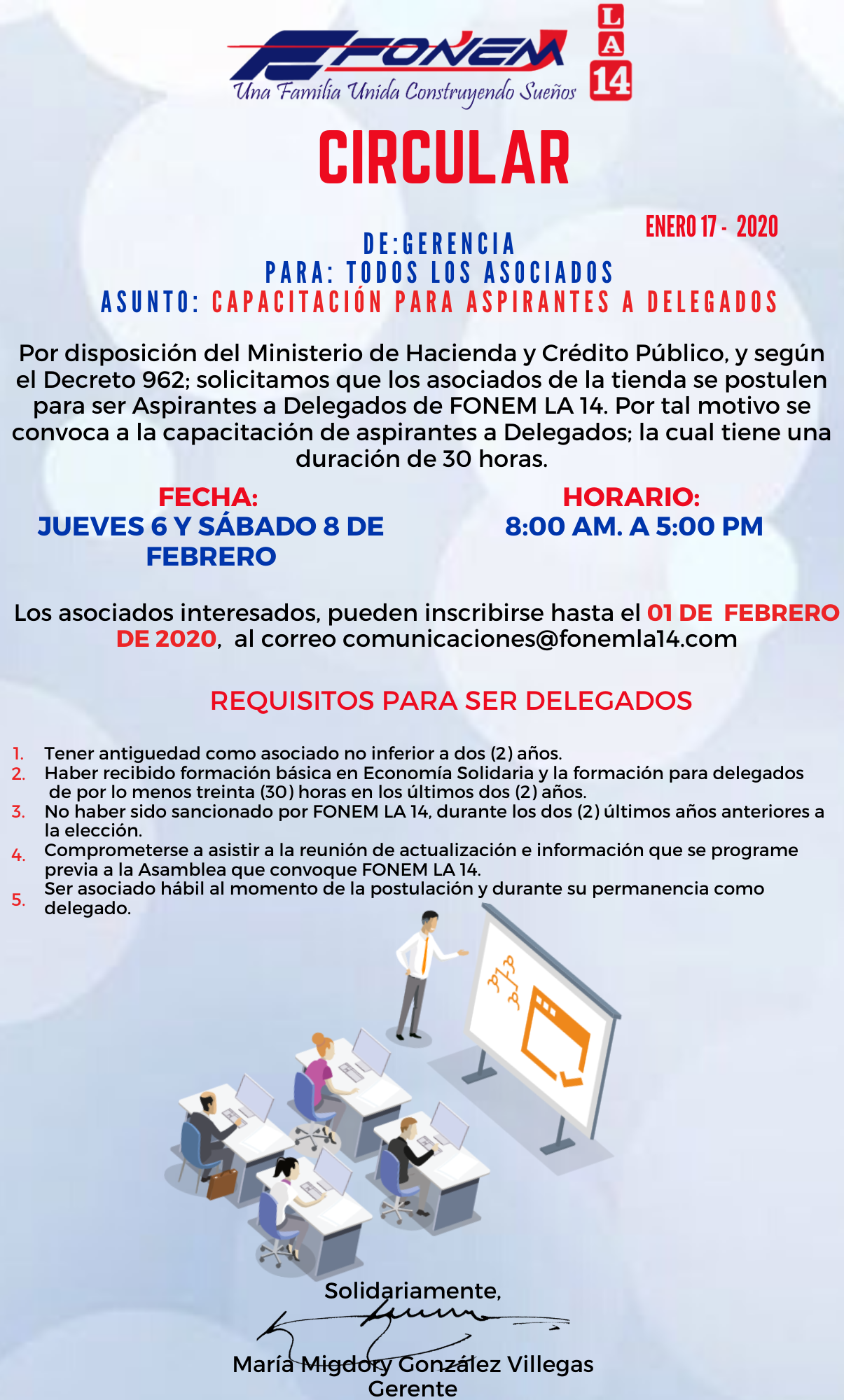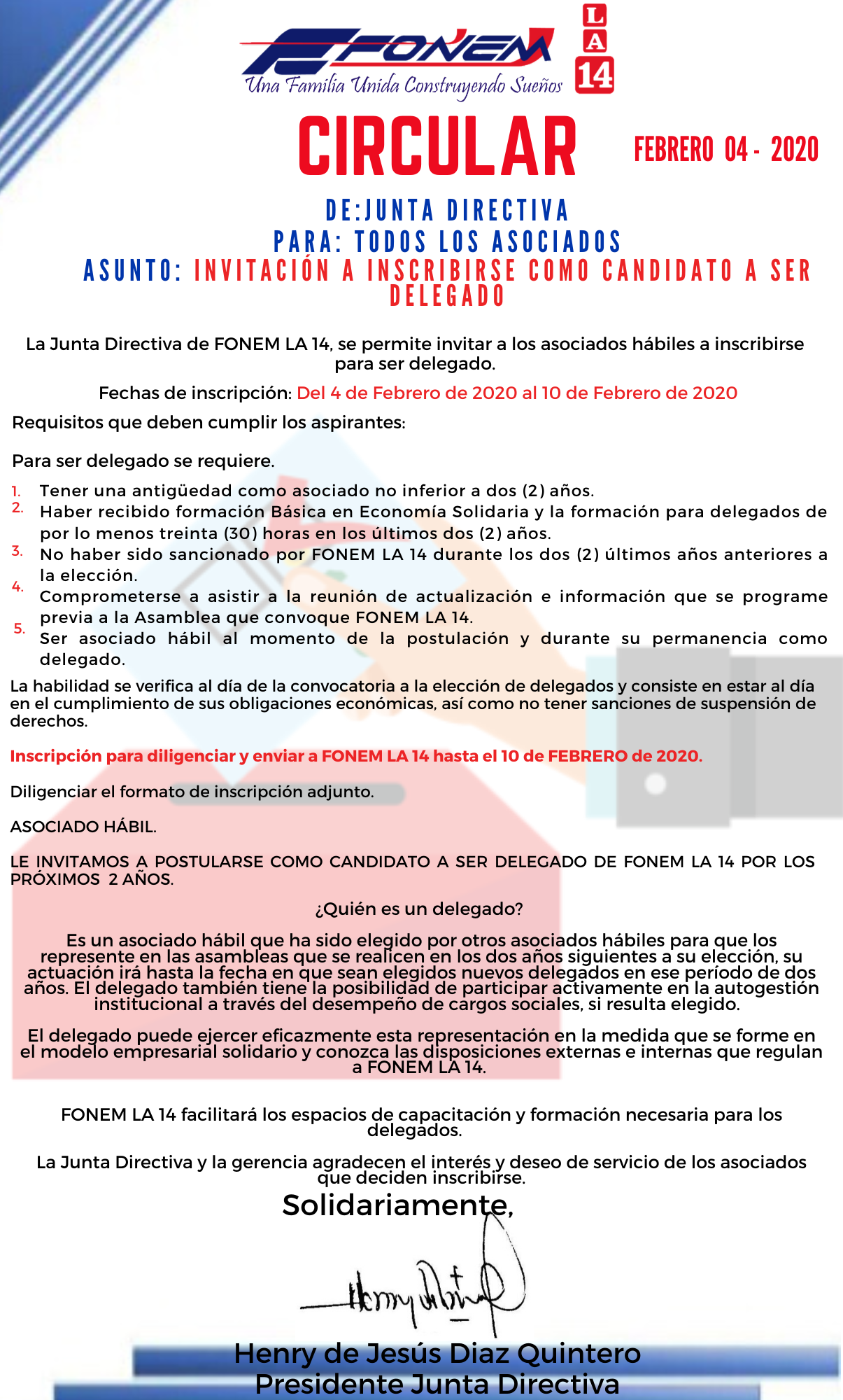 Apreciado asociado, le compartimos la circular donde informamos el proceso de inscripción para ser Delegado de FONEM LA 14.