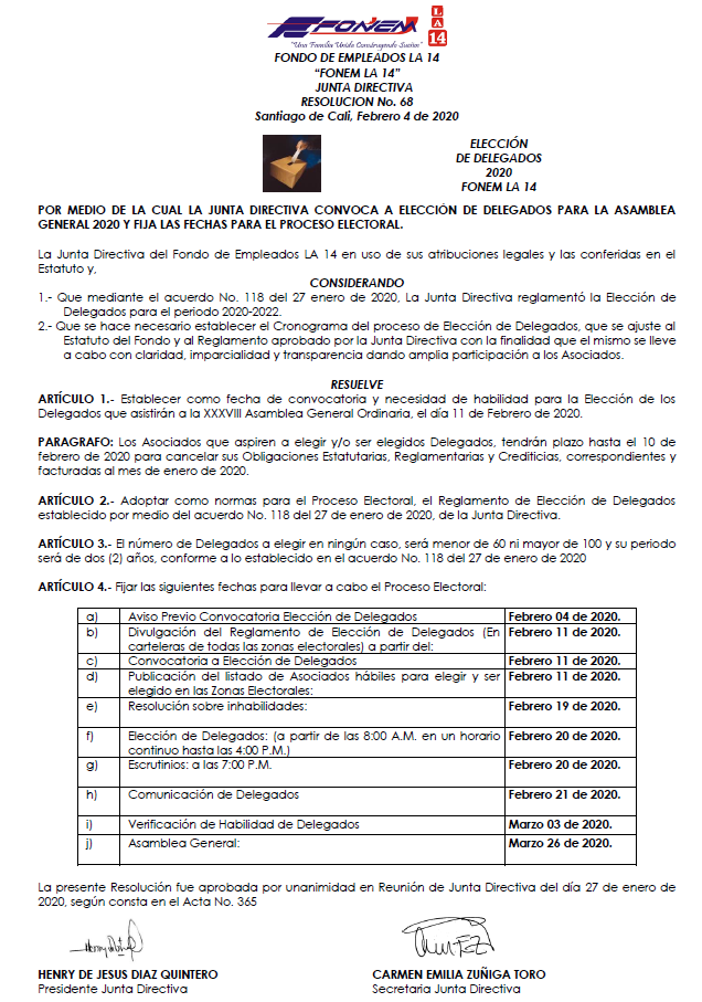 Apreciado asociado le compartimos la Resolución No. 68. Para la elección de los Delegados del Fondo de Empleados LA 14 "FONEM LA14" para el año 2020.