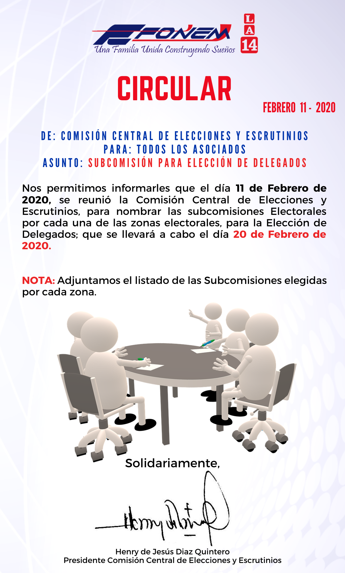 Apreciado asociado, le compartimos la circular donde informamos las subcomisiones electorales y escrutinios de Delegados de FONEM LA 14.