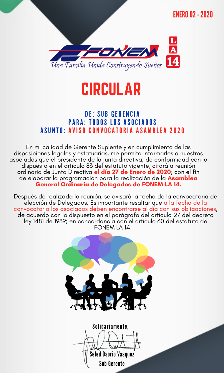 Apreciado asociado, le informamos la fecha de Convocatoria para la Asamblea 2020.