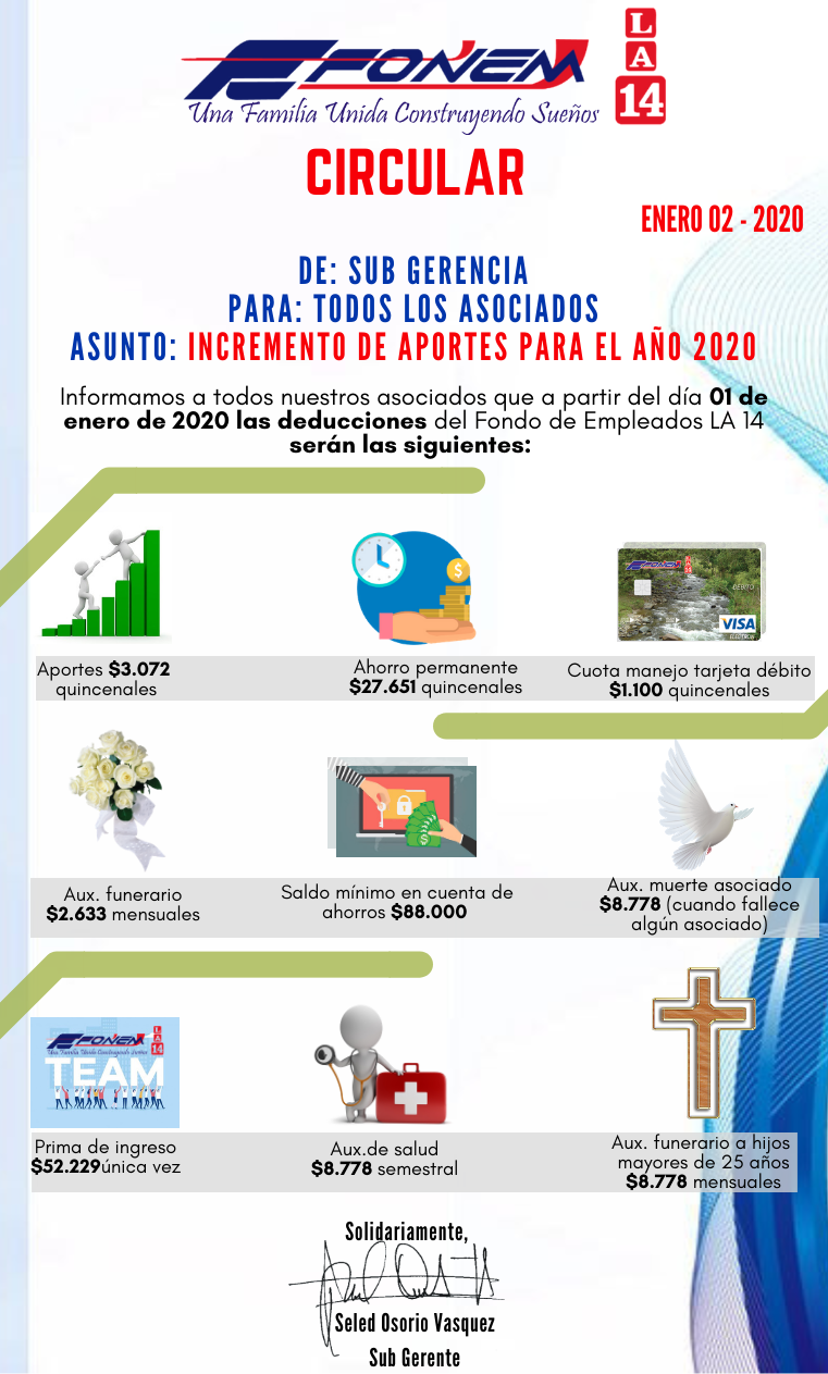 Apreciado asociado, le compartimos la información acerca del incremento de los aportes para el año 2020.