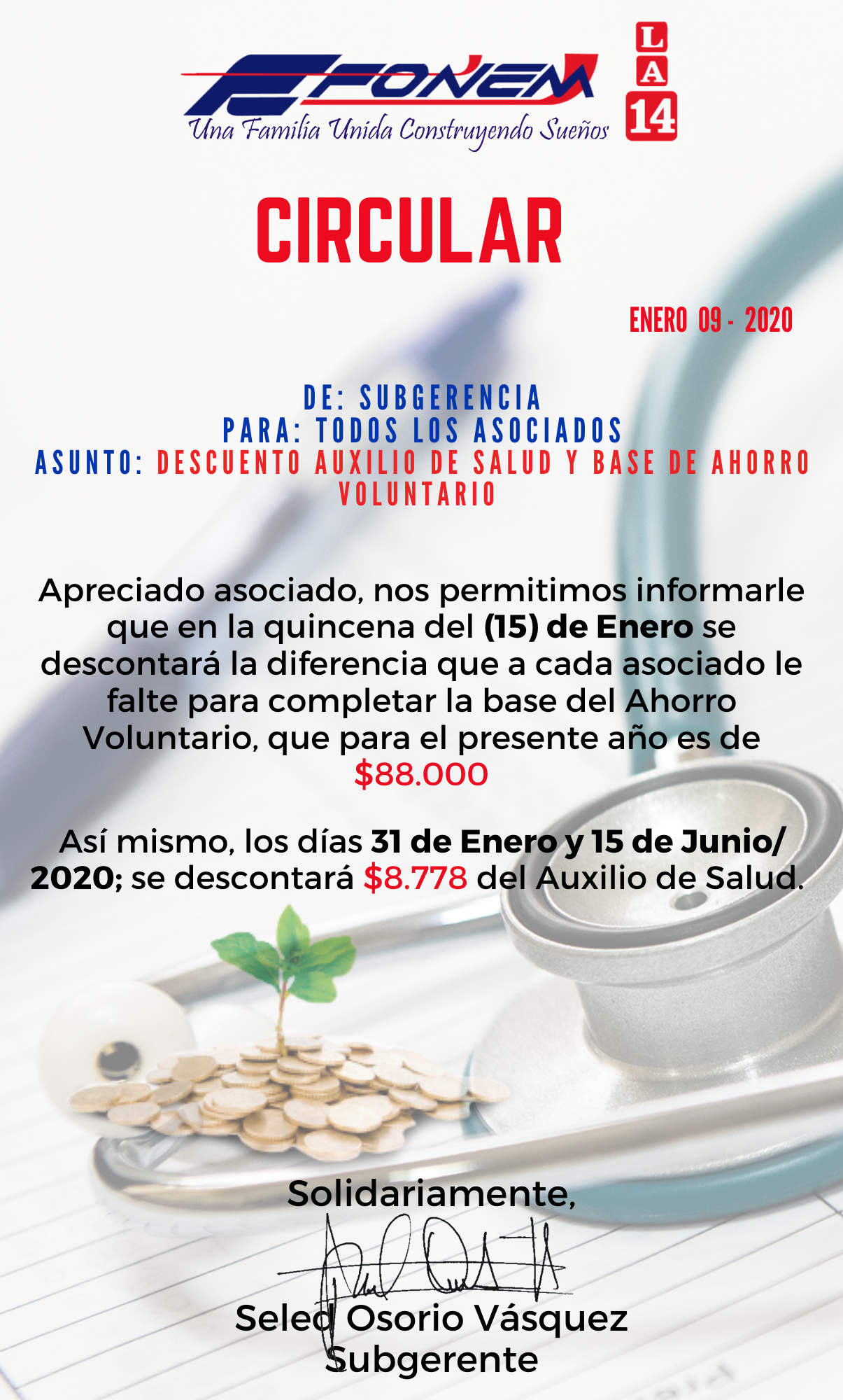 Apreciado Asociado, le informamos los descuentos que se van a realizar en el mes de Enero del presente año.