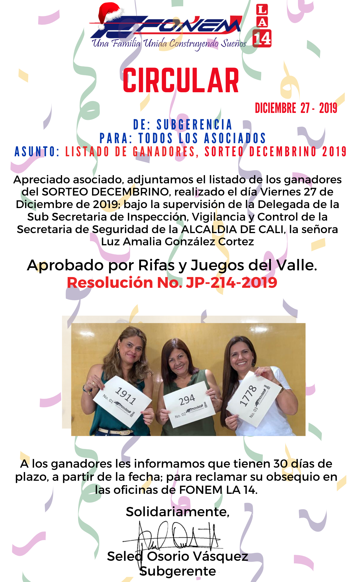 Le informamos que ya tenemos el listado de ganadores del Sorteo Decembrino 2019.