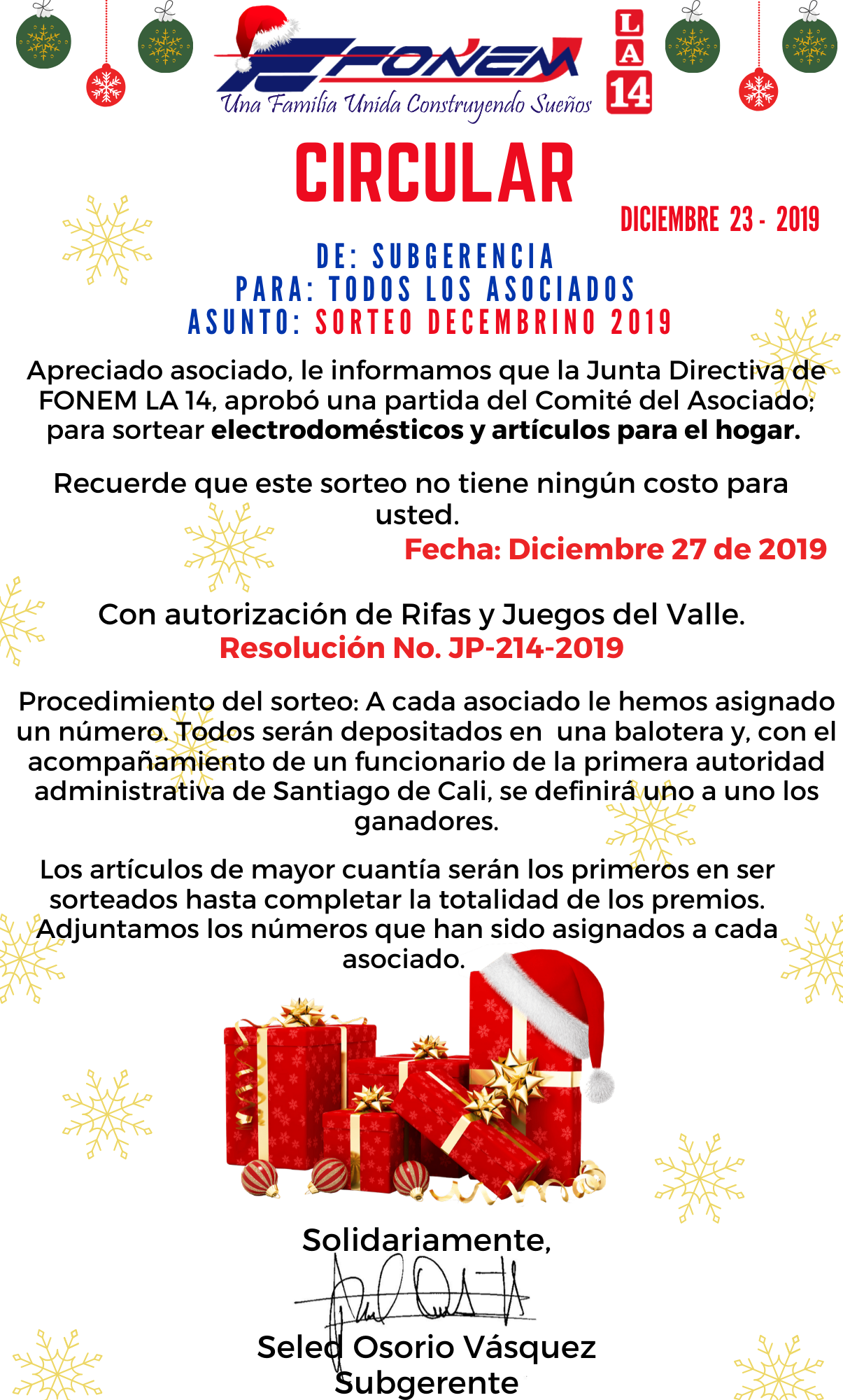 Apreciado asociado, le informamos que ya se encuentra disponible el número asignado a cada asociado para el Sorteo Decembrino. Este sorteo se realizará el día VIERNES 27 DE DICIEMBRE DE 2019.