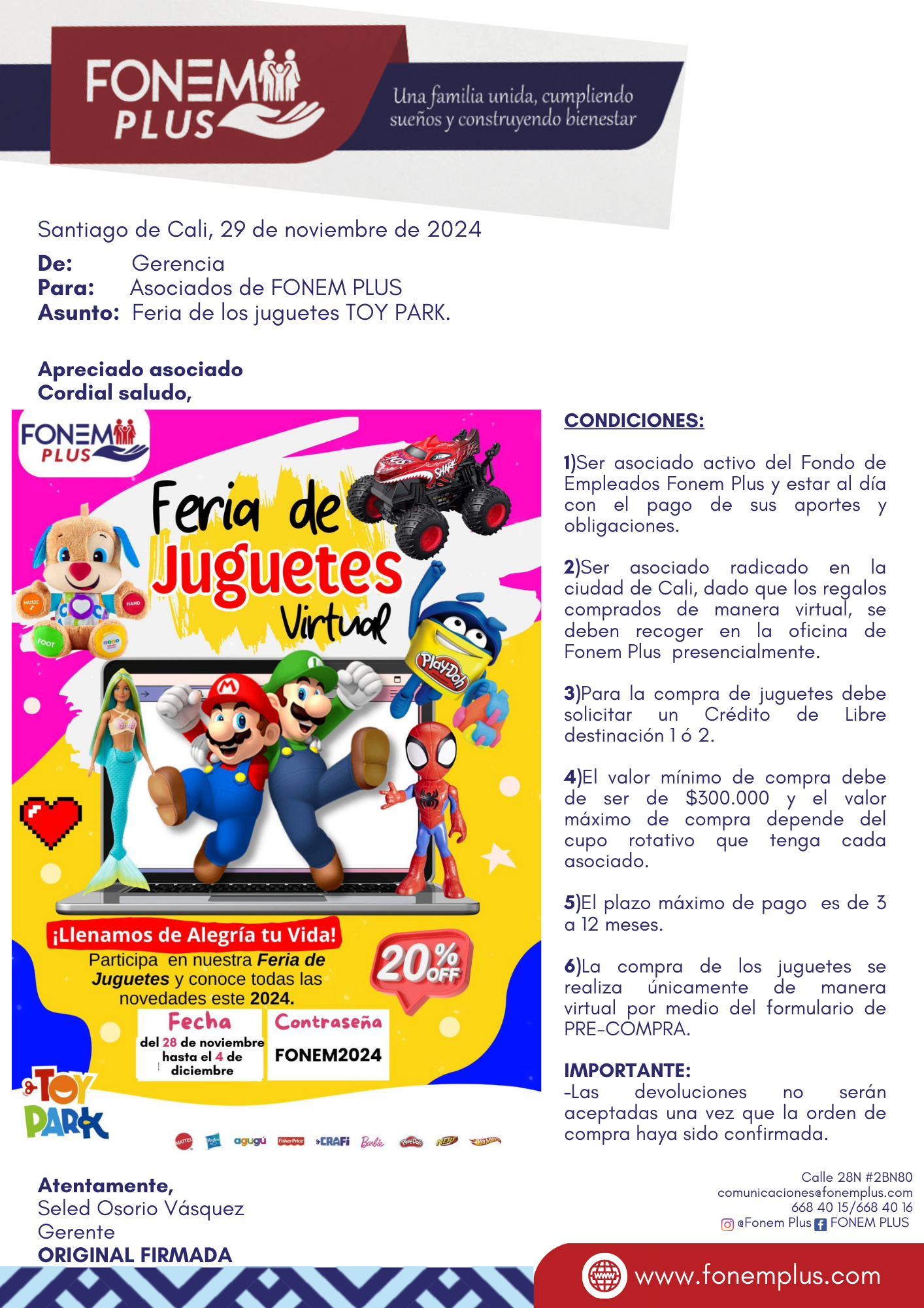 ¡GRAN FERIA VIRTUAL DE JUGUETES FONEM PLUS! DESCUENTOS IMPERDIBLES DISEÑADOS PARA TI ASOCIADO. Noviembre 29, 2024 29Nov Link para ver Catálogo de Juguetes de Toy Park: Link para acceder al Formulario de precompra de Toy Park:
