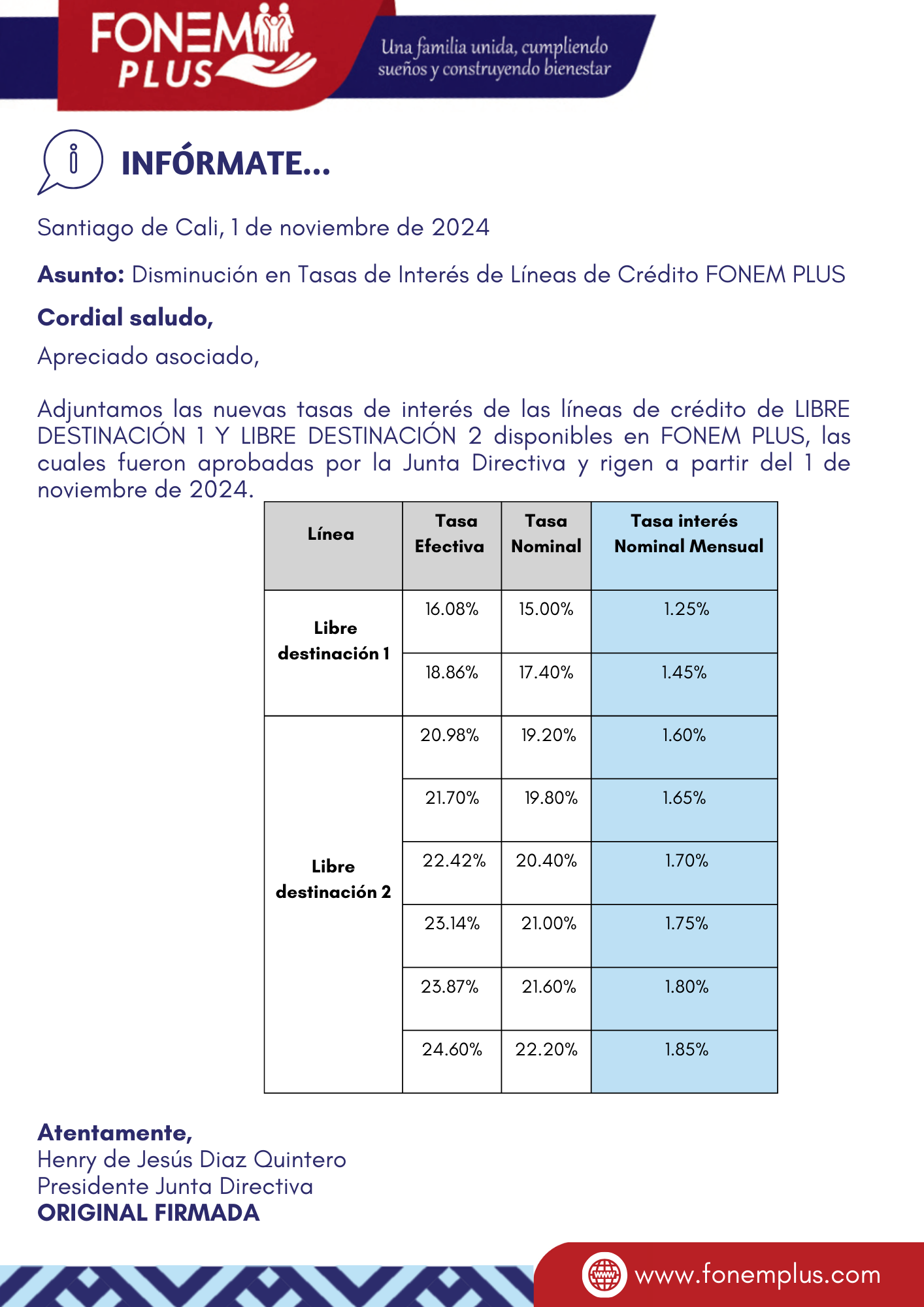 TASAS DE INTERÉS DE LAS LINEAS CRÉDITO DE FONEM PLUS ¡DISMINUYERON! Noviembre 1, 2024 1Nov Asociado, conoce esta información y consulta con nuestras asesoras los interesantes beneficios de estos cambios.