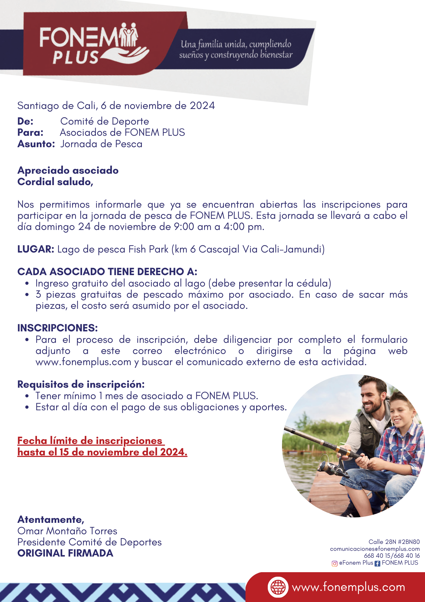 Las cañas de pescar ya están listas para disfrutar de una gran Jornada de Pesca en Fonem Plus. Noviembre 6, 2024 6Nov Te invitamos asociado el domingo 24 de noviembre a esta entretenida actividad. Asegura tu cupo, registrándote en este formulario. Link de formulario de inscripción JORNADA DE PESCA: