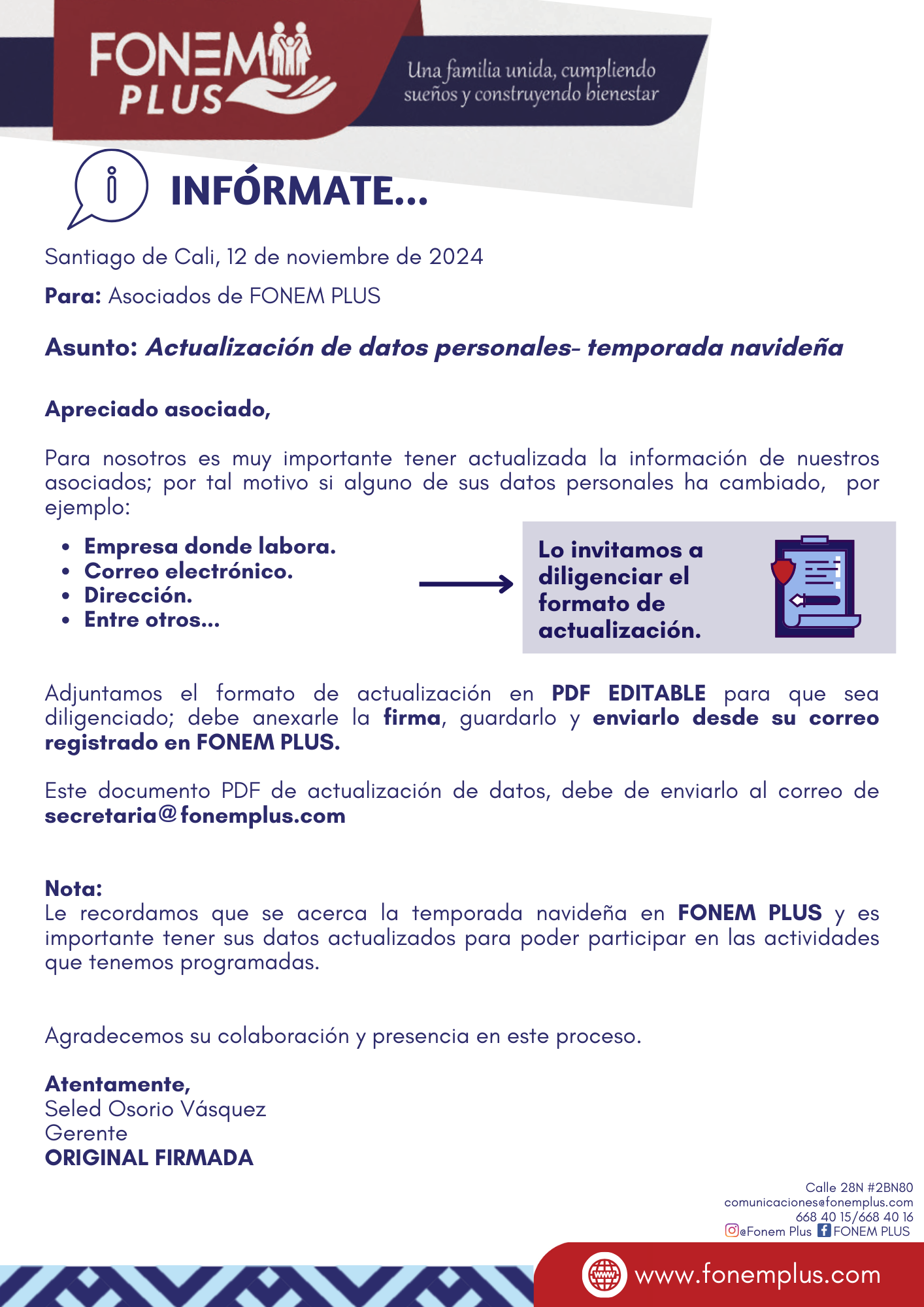 ¡Asociado, revisa tu correo! te enviamos la Actualización de Datos que es importante realizar antes de que termine el 2024. Noviembre 12, 2024 12Nov Formato de Actualización de Datos Sarlaft