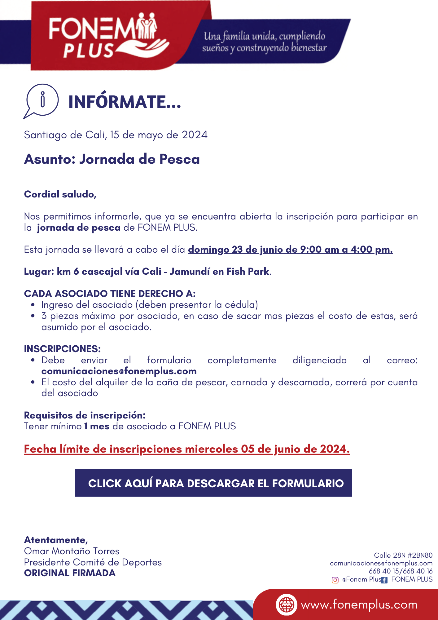 🎣 Jornada de pesca 2024🐟 (4) May 15, 2024 15May ¡YA LLEGÓ! 🎣 Jornada de pesca FONEM PLUS 2024🐟 📝Formulario de Inscripción.