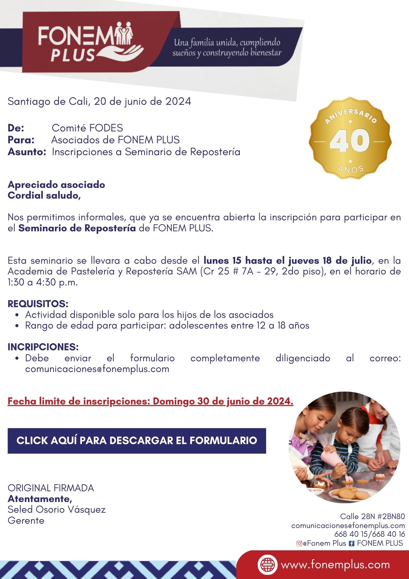 Seminario de Repostería Junio 19, 2024 19Jun ¡YA LLEGÓ! Seminario de Repostería 📝Formulario de Inscripción.
