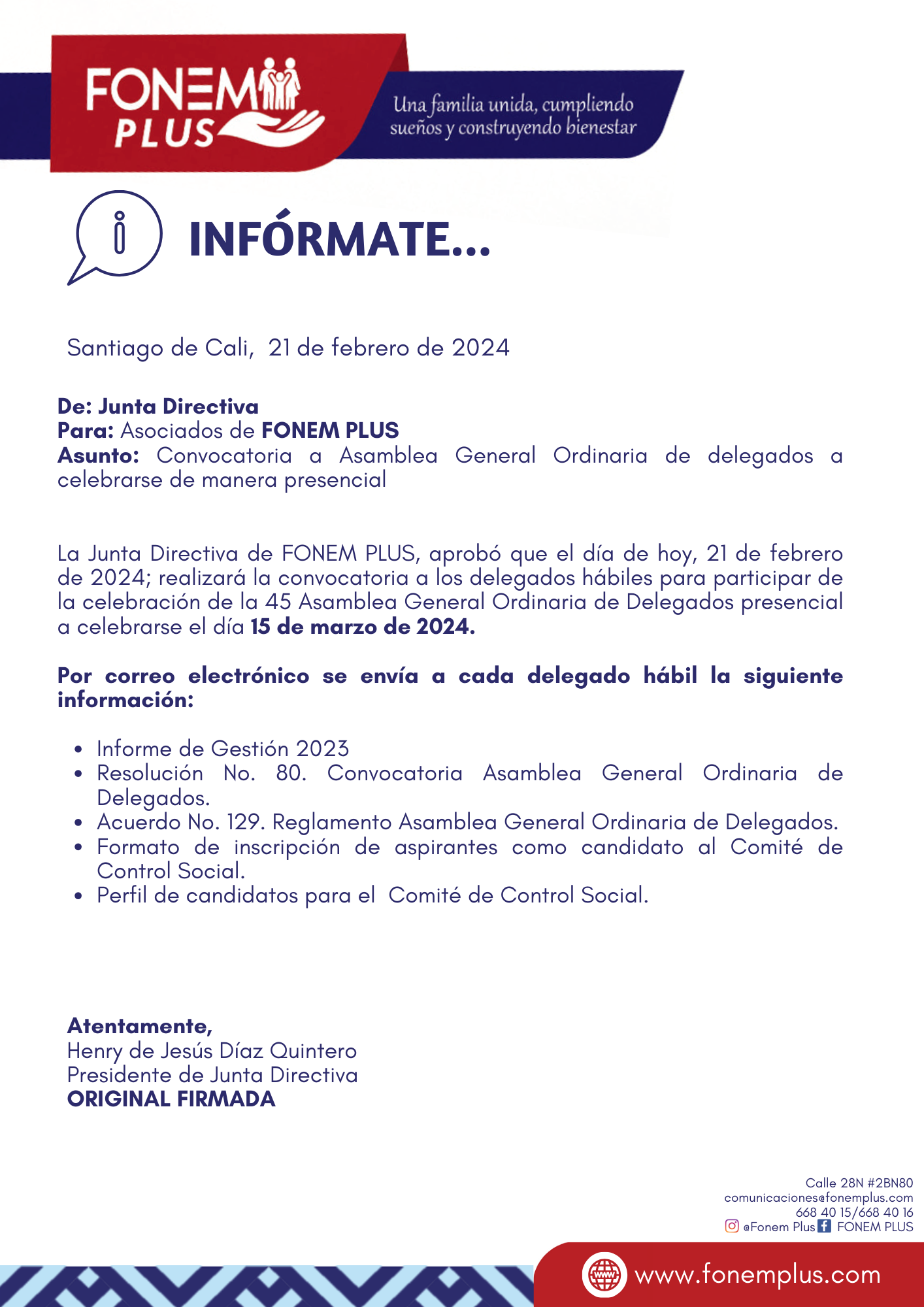 Apreciado asociado, le compartimos el informe de la Asamblea General Ordinaria de Delegados, celebrada el día 15 de marzo del 2024.